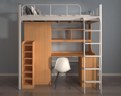 圖二中,同樣是一款鐵床與木制家具的結(jié)合,也有人叫它為鋼木結(jié)合床,實(shí)則就是將雙層鐵床的下鋪掏空,安裝了一個(gè)衣柜和書桌,雖然看上去簡(jiǎn)單,可設(shè)計(jì)出來和制造出來,卻不是那么簡(jiǎn)單的一回事了!