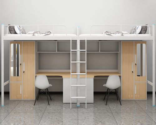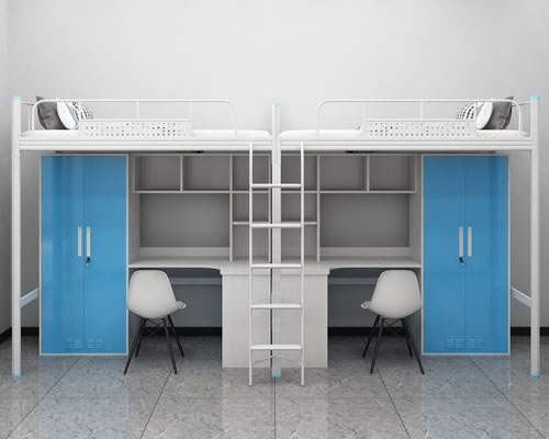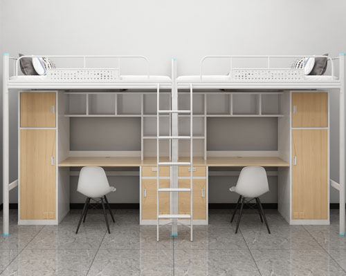 5、上面的兩種學生雙層鐵床,有的是以一個鐵架子床,配置一些木制的柜子和桌子,以顯得更大體,更實用一些,同樣,也可以更找成鐵柜子;它的價格一般是300多一張,具體還得找廠家實際報價!