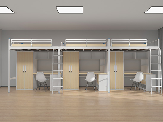 2、上邊的這個學(xué)生用的公寓床,它是一個兩連體的,上鋪是床位,下鋪依然是柜子和桌子,床架都是采用冷軋鋼板制成,而柜子和桌子都是同樣采用鐵制的,不僅經(jīng)用,還結(jié)實耐用,不易變形!