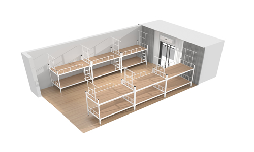 上圖二中所示,就是一個(gè)帶有蚊帳架的雙層鐵床的宿舍,看上去放有六張雙層鐵床,也有可能是兩張三連體的雙層鐵床,這樣更不會(huì)占用什么空間了,并且牢固性好,從而使一個(gè)小宿舍可以容納十二人,這樣的宿舍可能一些工廠都比較適用一些。